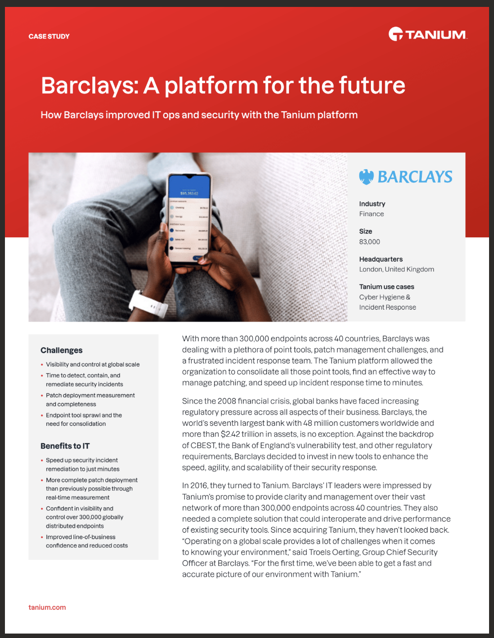 Barclays, one of the world’s largest banks with more than 48 million customers and over 300,000 endpoints across 40 countries, faced significant challenges managing a sprawling IT environment amid rising regulatory pressures and increasingly complex cyberthreats. The organization struggled with fragmented point tools, slow patch management processes, and an incident response workflow hindered by limited endpoint visibility. To modernize and unify its approach, Barclays adopted the Tanium platform in 2016.