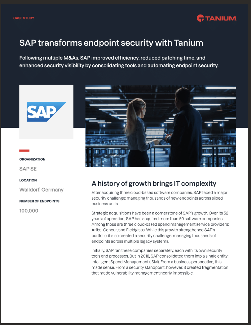 SAP transformed its global endpoint security by consolidating disparate tools and processes into a single, unified platform powered by Tanium. Following multiple acquisitions and expanding IT complexity, SAP’s Intelligent Spend Management organization gained real‑time visibility, automated patching, and streamlined vulnerability management for more than 100,000 endpoints. With Tanium Automate orchestrating multi‑step workflows and eliminating manual effort, SAP accelerated patching from a week to just hours, reduced operational risk, and dramatically improved security efficiency across its global environment.