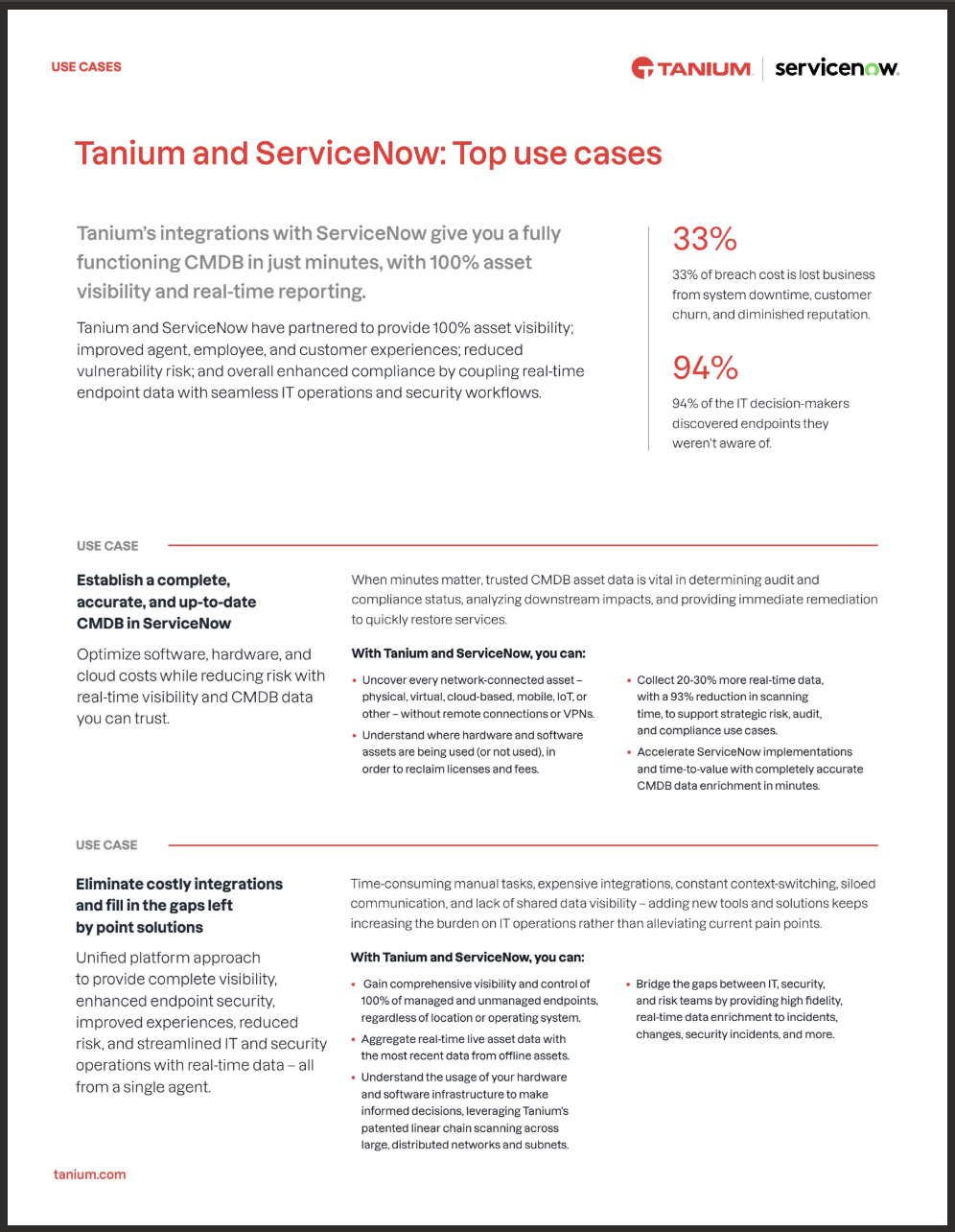 Organizations struggle with incomplete asset inventories, siloed data, and slow IT and security operations. Tanium’s native integrations with ServiceNow deliver real-time endpoint visibility, a fully enriched and accurate CMDB, and unified workflows across IT, security, and risk teams. By combining Tanium’s live asset, performance, vulnerability, and compliance data with ServiceNow’s automation and orchestration, organizations can accelerate incident response, reduce risk exposure, streamline change processes, and eliminate costly point solutions. The result is end‑to‑end visibility and control, improved employee experiences, and faster, more confident decision‑making across the enterprise.